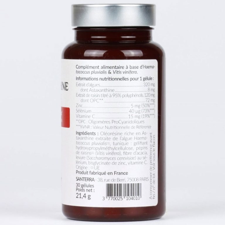 \nSanterra Astaxanthine Complexe dành cho làn da nhạy cảm tiếp xúc với ánh nắng mặt trời, hạn chế các đốm đồi mồi và cũng để cải thiện chức năng thị giác.