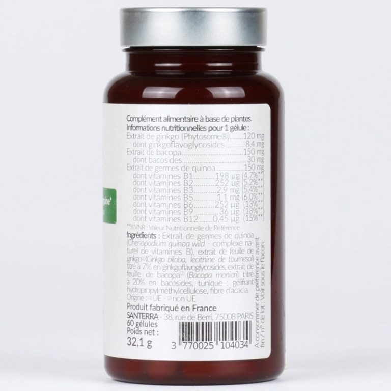 Hỗn hợp chiết xuất Ginkgo (Phytosome®) và Bacopa kết hợp với phức hợp vitamin B tự nhiên từ Quinoa. Phức hợp được khuyến nghị để hỗ trợ hoạt động của não (trí nhớ và khả năng tập trung) cũng như khả năng phản ứng từ tuổi vị thành niên cho đến tuổi già nhất.