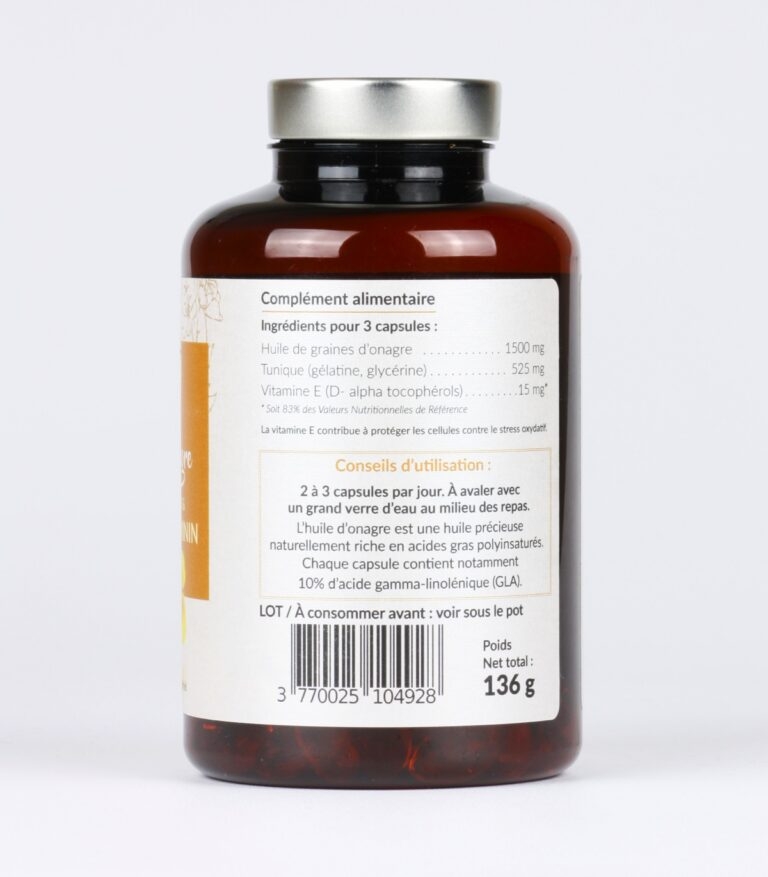 Santerra Huile d’Onagre chiết xuất từ hoa anh thảo từ lần ép lạnh đầu tiên, giàu omega 6. Được khuyên dùng để kiểm soát các vấn đề về da và rối loạn nữ tính.