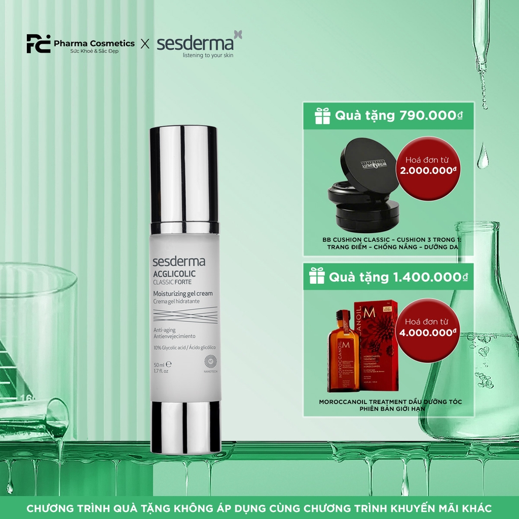 SESDERMA ACGLICOLIC CLASSIC GEL CREAM FORTE là kem dưỡng dạng gel lỏng, mang đến sức mạnh chống lão hóa, dưỡng ẩm và tái tạo vượt trội, giúp đạt được "hiệu ứng Photoshop" cho làn da. Sản phẩm được bào chế với 10% Axit Glycolic (dạng tự do và bọc Liposome) cùng công nghệ Nanotech, giúp giảm nếp nhăn, cải thiện kết cấu da và thu nhỏ lỗ chân lông một cách rõ rệt. Công thức này giúp tái cân bằng lớp sừng bằng các hoạt chất làm dịu và chống oxy hóa, phục hồi cấu trúc da và kích thích tổng hợp collagen, mang lại làn da tươi mới, rạng rỡ ngay từ lần đầu sử dụng.