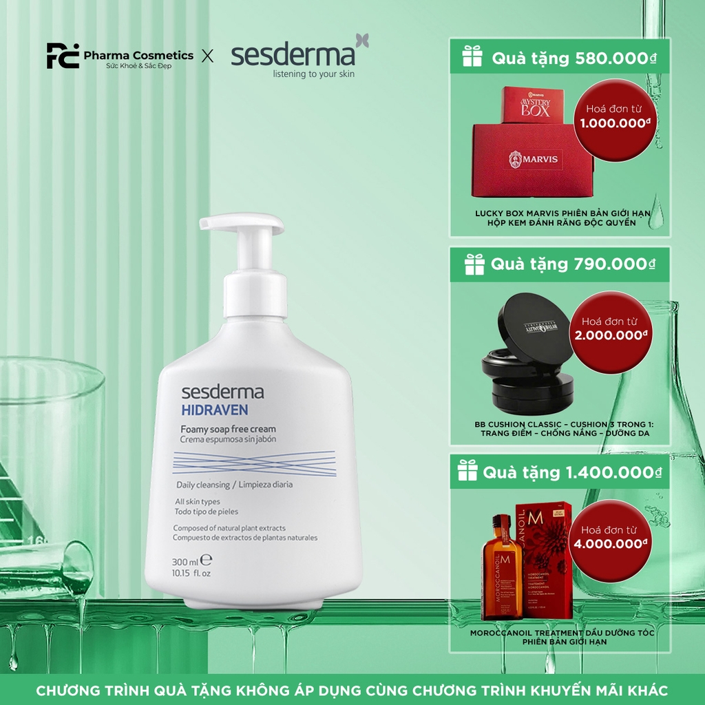 HIDRAVEN Foamy Soap-Free Cleanser là sữa rửa mặt dạng bọt, được bào chế đặc biệt với công thức không chứa xà phòng (Soap-free) và cực kỳ dịu nhẹ (ultra-gentle). Sản phẩm giúp làm sạch da hàng ngày một cách hiệu quả mà không gây khô căng hay kích ứng. HIDRAVEN loại bỏ tạp chất, cặn trang điểm và dầu thừa, đồng thời duy trì sự cân bằng độ ẩm tự nhiên của da. Được làm giàu với các chiết xuất thực vật như Cúc La Mã, Yến Mạch, Lô Hội và Mimosa, sản phẩm làm dịu, cấp ẩm và bảo vệ, lý tưởng cho mọi loại da, kể cả da nhạy cảm, da dễ nổi mụn hoặc da phản ứng.