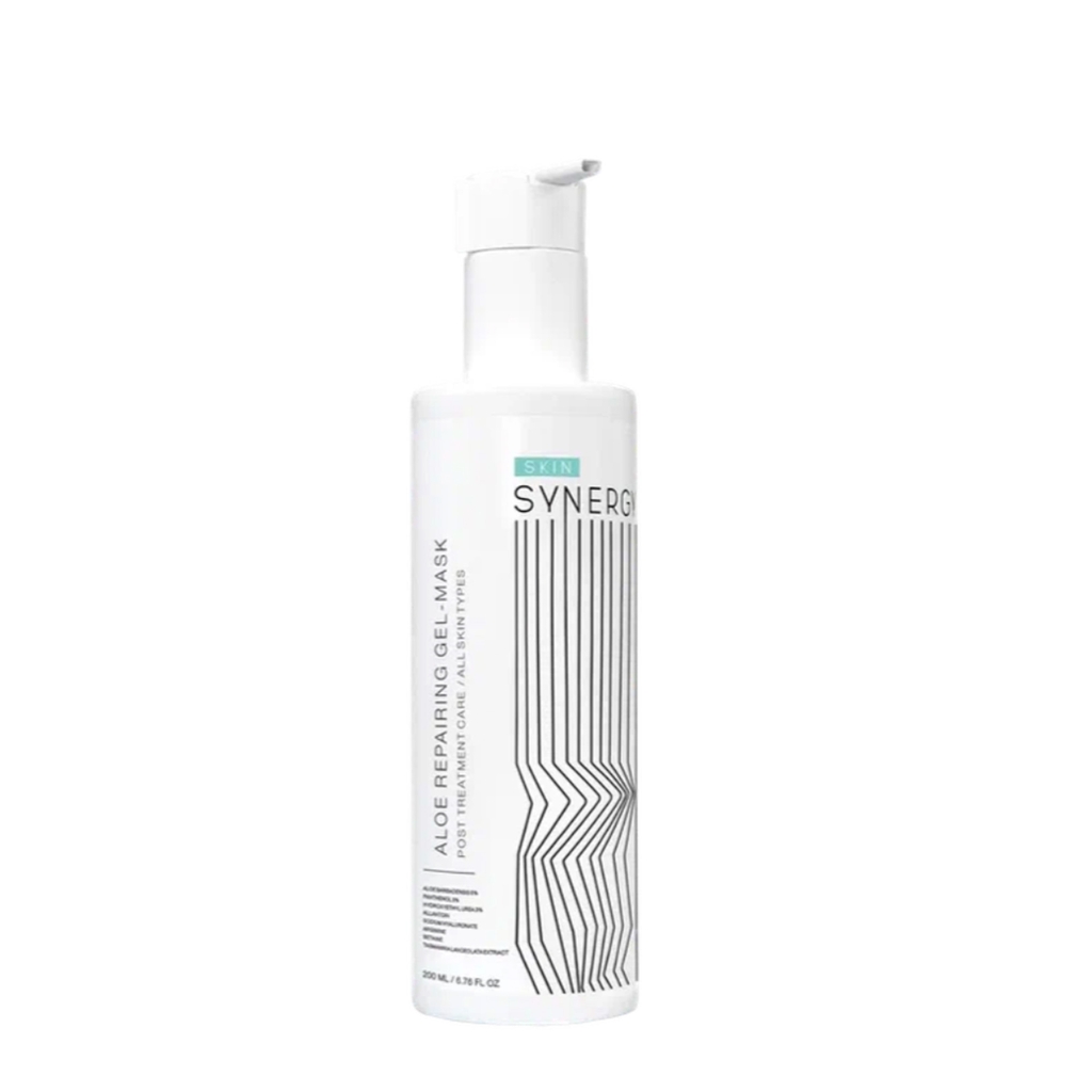 SKIN SYNERGY ALOE REPAIRING GEL-MASK là mặt nạ dạng gel với chiết xuất lô hội, được thiết kế chuyên biệt để chăm sóc và phục hồi làn da, đặc biệt là sau các liệu trình thẩm mỹ như peel da hoặc làm sạch sâu. Với công thức chứa Gel Lô Hội 5%, Panthenol 3%, Hydroxyethyl Urea 3%, Allantoin, Hyaluronic Acid, Arginine, Betaine và Chiết xuất Tiêu Tasmania, mặt nạ này mang lại khả năng làm dịu, cung cấp độ ẩm sâu và làm mới làn da. Kết cấu gel gốc nước giúp sản phẩm dễ dàng thẩm thấu, hỗ trợ quá trình phục hồi bề mặt và tái tạo da, đồng thời giảm thiểu cảm giác kích ứng sau các thủ thuật xâm lấn.