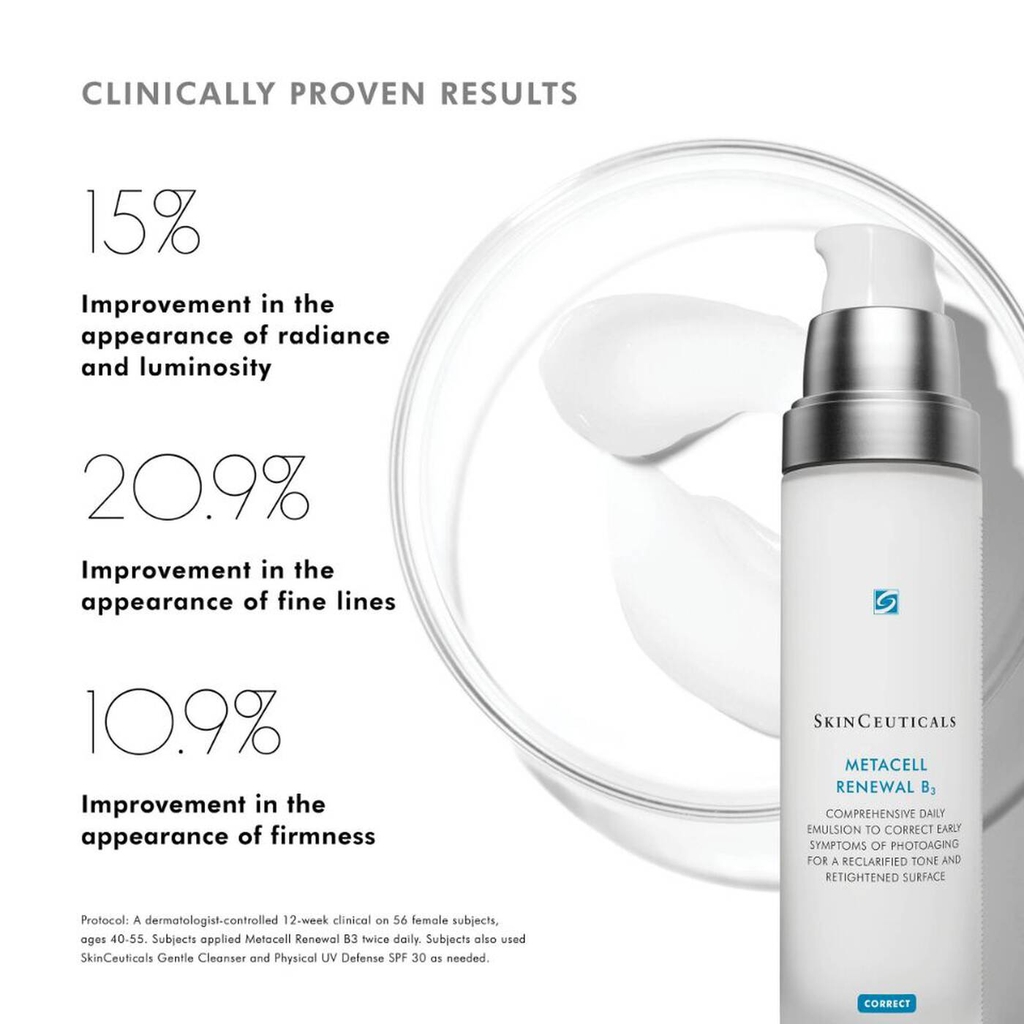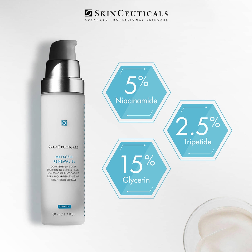 Sữa dưỡng Metacell Renewal B3 là sản phẩm độc quyền của SkinCeuticals. Thành phần sản phẩm bao gồm 15% Glycerin tinh khiết dạng lỏng (hiện đang chờ cấp bằng sáng chế), Niacinamide (vitamin B3) 5%, và hợp chất Tripeptide giúp làm săn chắc da, cải thiện những dấu hiệu lão hóa như da thiếu đàn hồi, xỉn màu, không đều màu, và nhiều khuyết điểm. Metacell Renewal B3 hỗ trợ chống lại những dấu hiệu lão hóa da bằng cách thúc đẩy sản sinh tế bào, tái tạo bề mặt da, từ đó giúp làm đều màu da, giảm thiểu nếp nhăn trên da, khiến da trở nên căng mịn hơn.