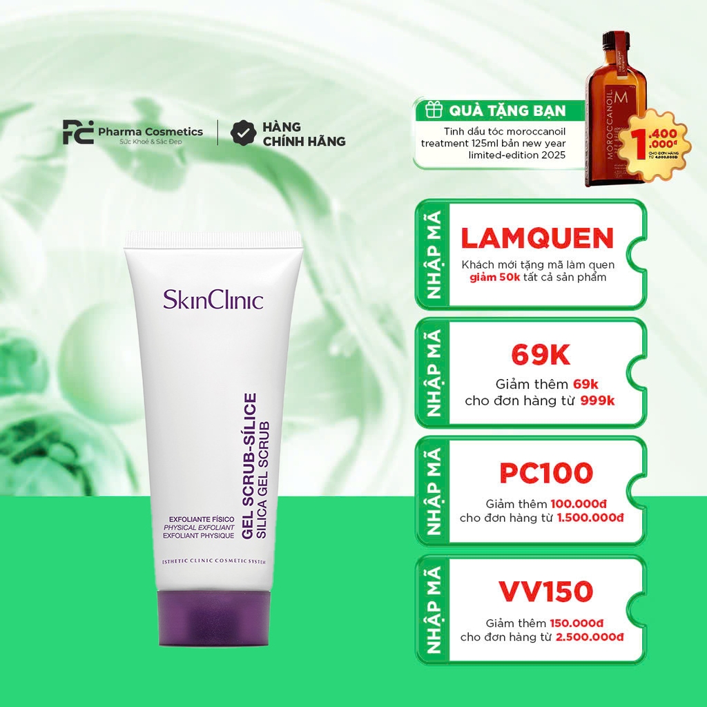 SKINCLINIC Gel Scrub-Sílice là sản phẩm tẩy tế bào chết vật lý dạng gel, sử dụng các hạt cầu Silica hữu cơ (tinh thể nano Calcium) giúp làm sạch sâu mà không gây tổn thương hay mài mòn da. Sản phẩm này không chỉ loại bỏ hiệu quả các tế bào da chết, bã nhờn và mụn đầu đen, mà còn hỗ trợ làm mịn bề mặt da. Gel Scrub-Sílice còn được khuyên dùng trước các liệu trình peel hoặc điều trị thẩm mỹ chuyên sâu để giúp da hấp thu dưỡng chất tốt hơn, đồng thời tăng cường sức đề kháng và tái tạo da, mang lại làn da sạch thoáng, mịn màng và khỏe mạnh.