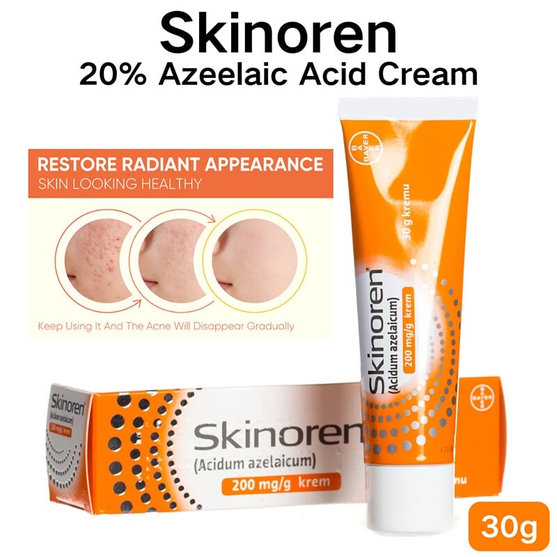 Skinoren Acidum Azelaicum là dược mỹ phẩm đặc trị mụn trứng cá (acne vulgaris) đến từ thương hiệu Bayer. Với nồng độ 20% Azelaic Acid, sản phẩm mang lại khả năng kháng khuẩn, kháng viêm mạnh mẽ, giúp giải quyết triệt để các vấn đề về mụn, làm mờ vết thâm và hỗ trợ điều trị Rosacea. Skinoren hoạt động bằng cách tấn công vi khuẩn Propionibacterium acnes – tác nhân chính gây mụn, đồng thời ngăn chặn sự sừng hóa nang lông để làn da luôn thông thoáng.