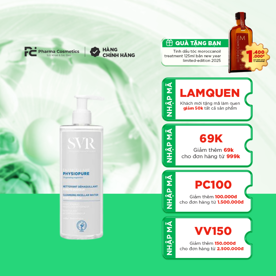 - Nước Tẩy Trang SVR Physiopure Eau Micellaire giúp làm sạch sâu và tẩy trang hoàn hảo cho da mặt bạn. Sản phẩm với các tinh thể nước tinh khiết giúp loại bỏ các chất bẩn và cặn trang điểm, cho làn da sạch và sáng mà không gây nhờn dính. Sản phẩm có độ pH sinh lý, không chứa Paraben, cồn, xà phòng, chất tạo màu. Sản phẩm dành cho mọi loại da, đặc biệt là da nhạy cảm.