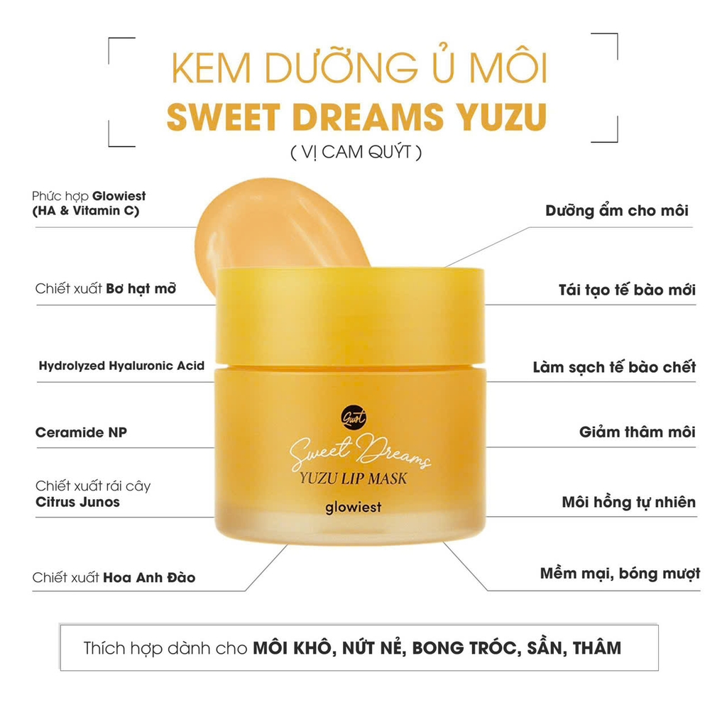 Sweet Dreams Yuzu là mặt nạ ngủ môi với chiết xuất từ cam quýt Yuzu giàu Vitamin C, kết hợp cùng các thành phần dưỡng ẩm vượt trội, giúp phục hồi đôi môi khô ráp, nứt nẻ, cho bạn làn môi căng mọng, hồng hào tự nhiên.