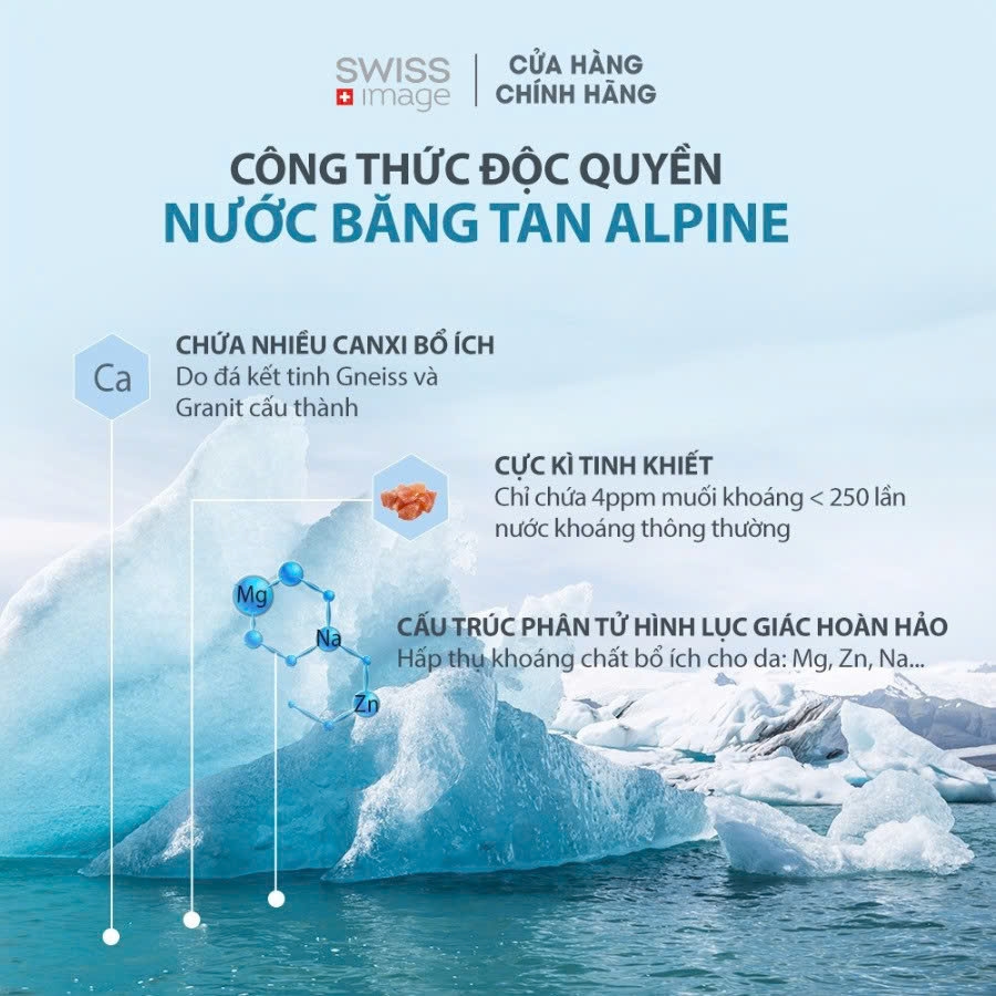 Nguồn nước băng tan Alpine: Chứa hàm lượng khoáng chất quý giá (Canxi, Kẽm...) giúp tái tạo, làm dịu và tăng cường hàng rào bảo vệ da.
