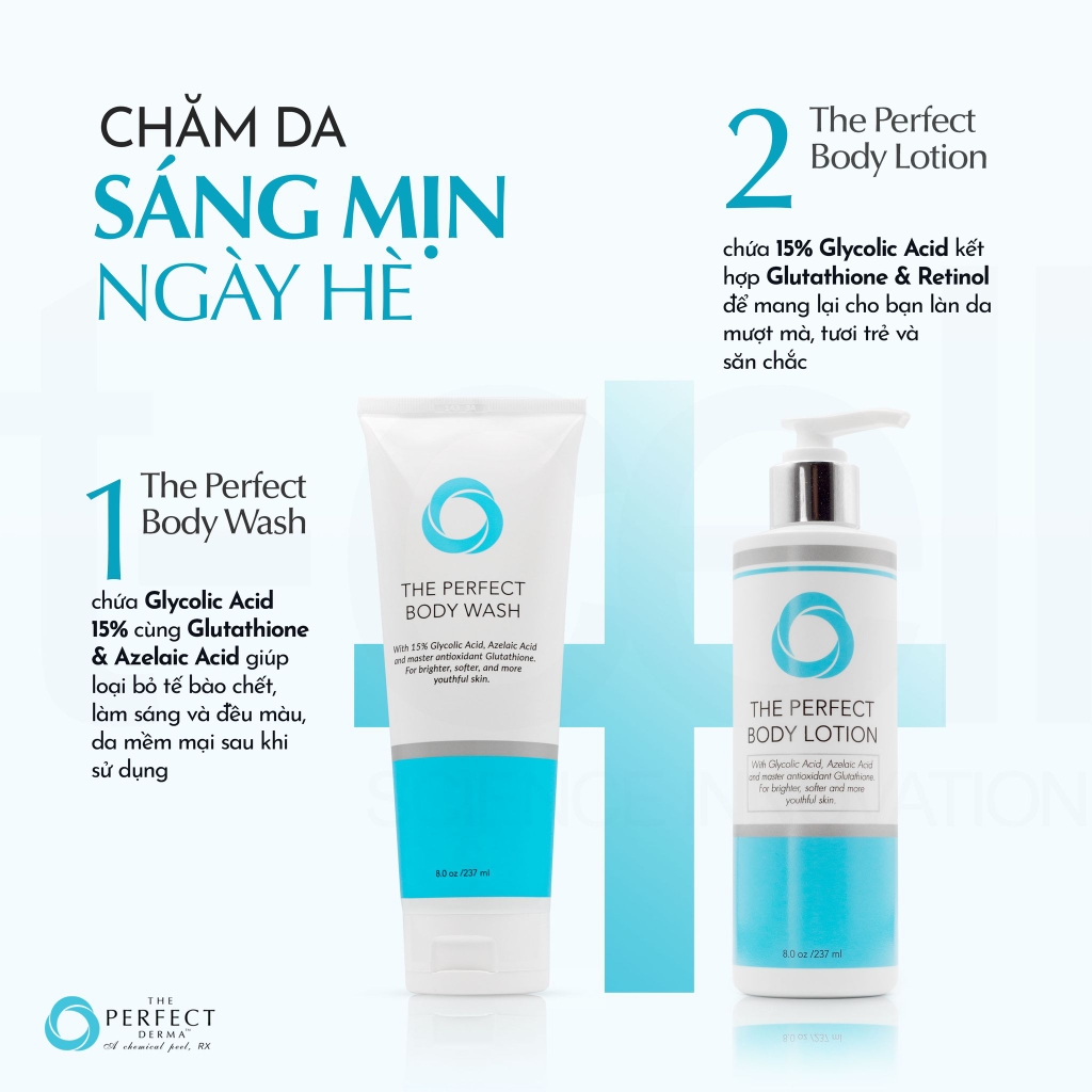 Bộ đôi dưỡng da cơ thể THE PERFECT BODY WASH và THE PERFECT BODY LOTION là giải pháp toàn diện giúp làm sạch, tẩy tế bào chết, dưỡng ẩm sâu và làm sáng da hiệu quả. Sự kết hợp hoàn hảo giữa sữa tắm làm sạch dịu nhẹ và lotion dưỡng ẩm chuyên sâu mang đến làn da cơ thể mềm mại, mịn màng, tươi sáng và đều màu hơn. Với các thành phần hoạt tính mạnh mẽ như Glycolic Acid, Glutathione và các dưỡng chất quý giá, bộ đôi này là lựa chọn lý tưởng để chăm sóc và cải thiện làn da cơ thể hàng ngày.