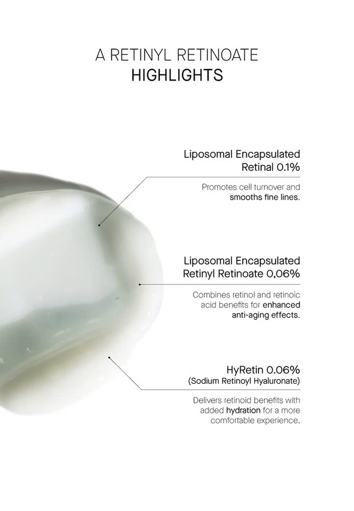 Thành phần chi tiết: Aqua (Nước), Caprylic/Capric Triglyceride, Coco-Caprylate, Glycerin, Dimethicone, Tribehenin PEG-20 Este, Silica, Coco-Caprylate/Caprate, Betaine, Panthenol, Cetearyl Alcohol, PPG-13-Decyltetradeceth-24, Retinal, Retinyl Retinoate, Sodium Retinoyl Hyaluronate, Jojoba Este, Helianthus Annuus (Hoa hướng dương) Sáp hạt,