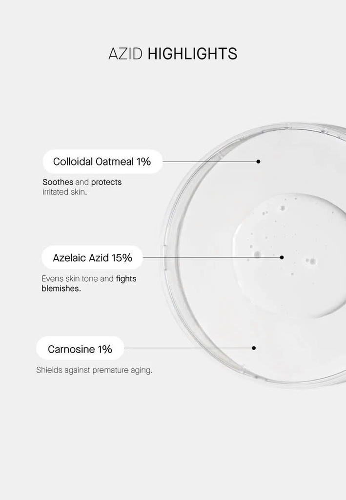 Azelaic Acid 15%: Hoạt chất vàng trong điều trị mụn, có khả năng kháng khuẩn, giảm viêm, giảm sưng đỏ, mờ thâm, kiểm soát dầu thừa và ngăn ngừa mụn tái phát.