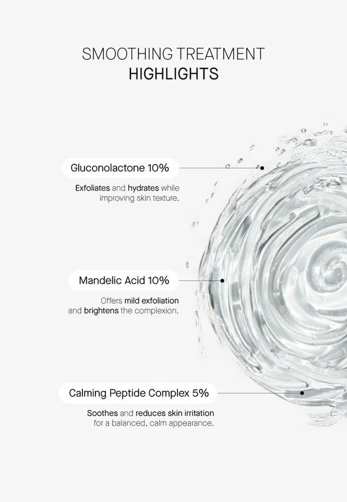 Theramid Smoothing Treatment là liệu pháp tái tạo da với sự kết hợp hoàn hảo giữa 10% Gluconolactone (PHA) và 10% Mandelic Acid (AHA) cùng phức hợp peptide 5%, giúp tẩy tế bào chết nhẹ nhàng, kích thích tái tạo tế bào mới, đồng thời làm dịu da, giảm kích ứng. Sản phẩm phù hợp với mọi loại da, kể cả làn da nhạy cảm.