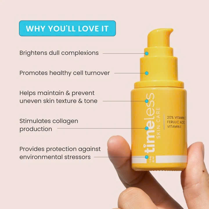 TIMELESS 20% VITAMIN C + E FERULIC ACID SERUM là tinh chất dưỡng sáng và chống oxy hóa mạnh mẽ, được mệnh danh là "The Brightener", mang đến một liều lượng lớn 20% Vitamin C tinh khiết (L-Ascorbic Acid). Công thức được tăng cường với Vitamin E và Ferulic Acid, tạo nên bộ ba chống oxy hóa hoàn hảo, cung cấp khả năng bảo vệ da 24/7 khỏi các tác nhân gây hại từ môi trường và ô nhiễm. Serum là giải pháp lý tưởng cho làn da xỉn màu, không đều màu và căng thẳng, giúp cải thiện sắc tố, xây dựng collagen và làm đều tông da.
