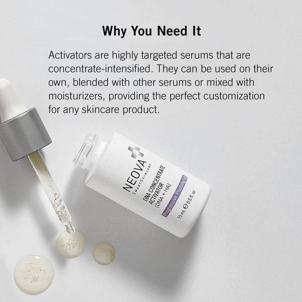 NEOVA DNA CONCENTRATE ACTIVATOR (DNA+HA) là tinh chất đột phá đến từ Mỹ, chứa đựng công thức độc quyền với sự kết hợp giữa enzyme sửa chữa DNA và Hyaluronic Acid siêu nhỏ, mang lại khả năng phục hồi hư tổn, tái tạo và chống lão hóa vượt trội cho làn da. Sản phẩm giúp đánh thức vẻ đẹp tiềm ẩn, trả lại làn da tươi trẻ, khỏe mạnh và rạng rỡ.