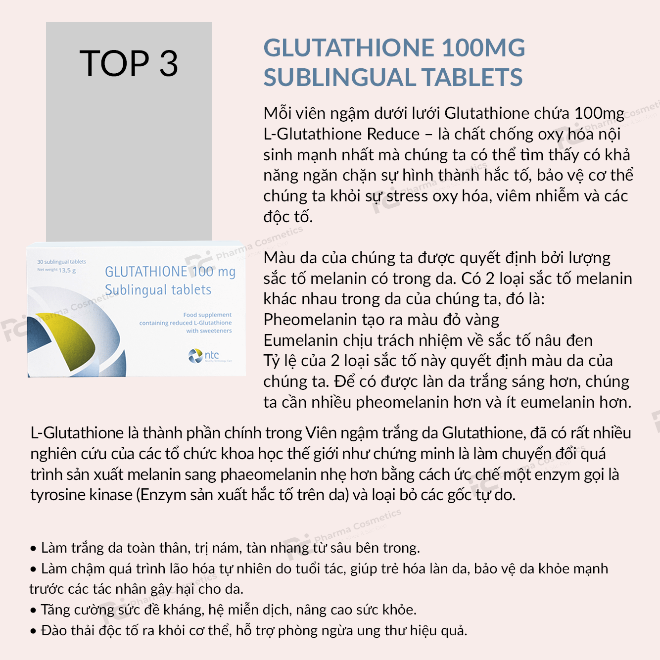 chi tiết sản phẩm: https://pharmacosmetics-vn.com/glutathione-100mg-sublingual-tablets-vien-ngam-trang-da