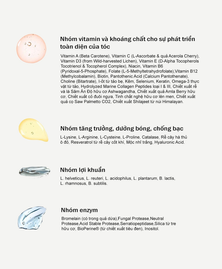 \nNHÓM VITAMIN, KHOÁNG CHẤT VÀ CÁC DƯỠNG CHẤT CẦN THIẾT CHO SỰ TĂNG TRƯỞNG TOÀN DIỆN CỦA TÓC: