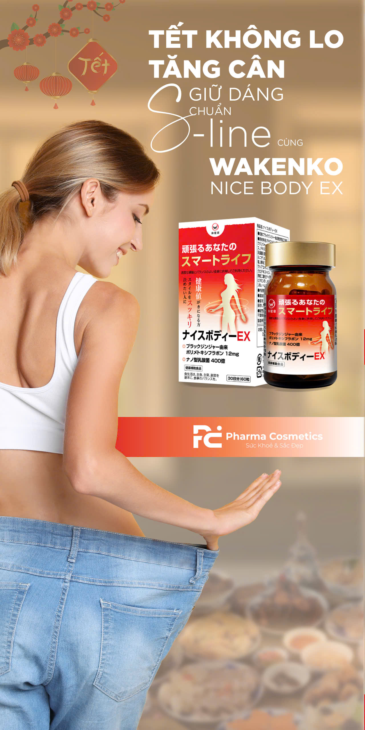 Viên uống giảm mỡ bụng WAKENKO NICE BODY EX 60 VIÊN - Giải pháp hỗ trợ giảm cân an toàn và hiệu quả từ Nhật Bản. Sản phẩm kết hợp sức mạnh của Polymethoxy Flavone, lợi khuẩn nano acid lactic, chiết xuất cây keo Salacia và L-carnitine, cùng các vitamin, khoáng chất thiết yếu, giúp đốt cháy mỡ thừa, đặc biệt là mỡ bụng, cải thiện hệ tiêu hóa và tăng cường sức khỏe toàn diện.