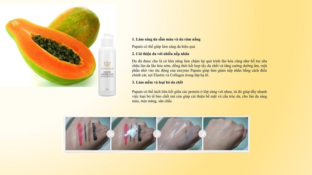 Papain (từ Đu đủ): Hoạt chất enzyme chính giúp phân hủy tế bào chết, làm mịn bề mặt da và giảm kích ứng.